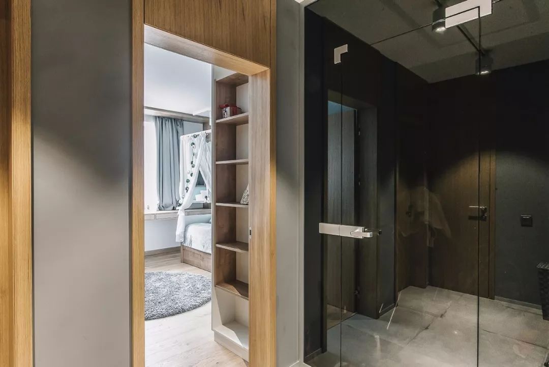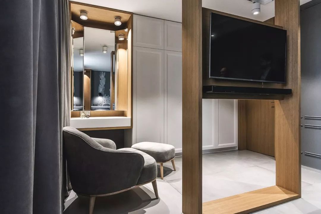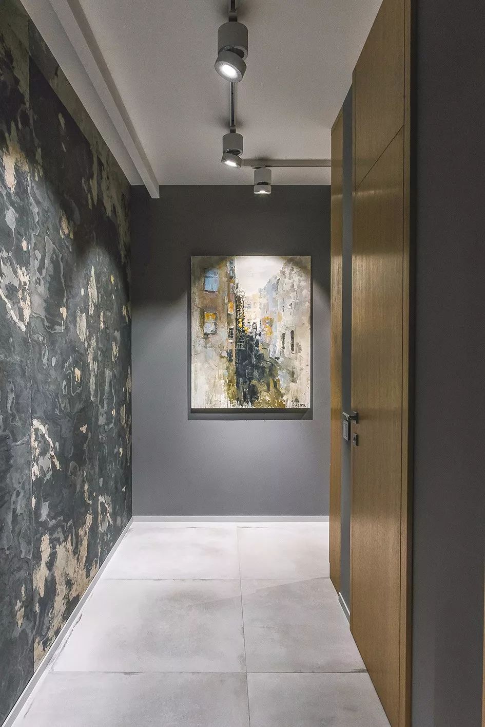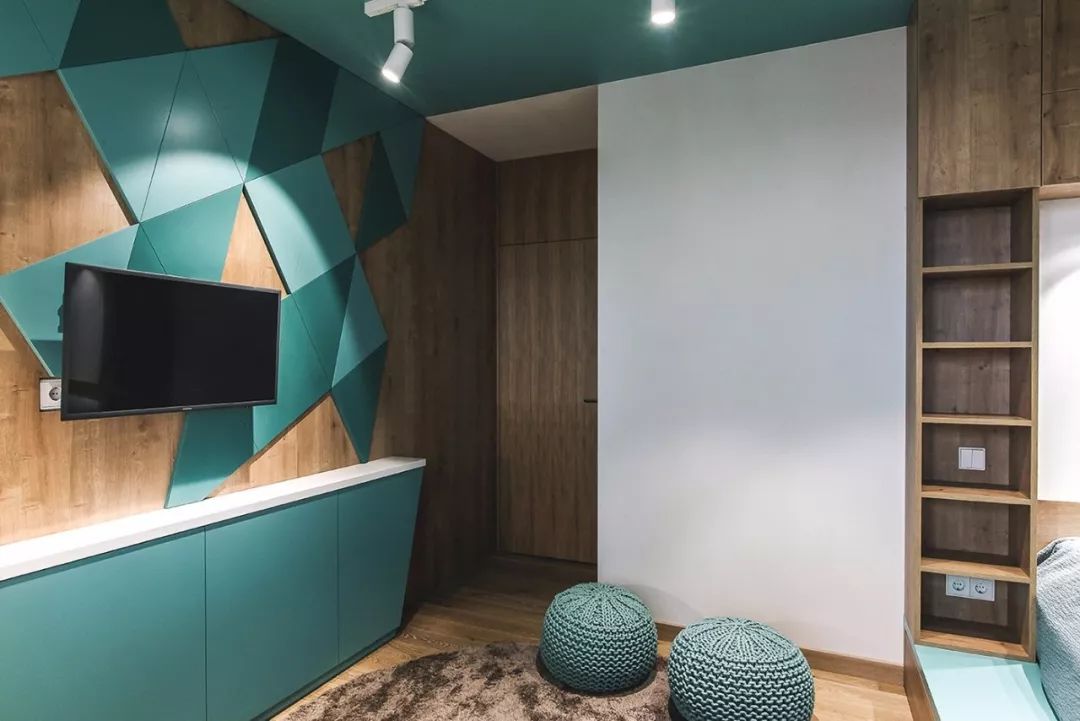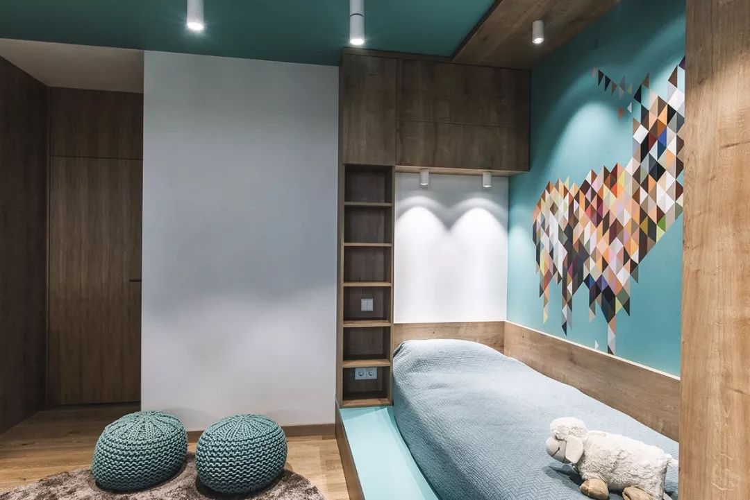 Levko Davydiuk以簡約的設(shè)計(jì)手法來詮釋,105平方米也可以別致,冷色系的灰色廚房、房間,藍(lán)色系兒童房,輔以暖色系的木作電視墻和木質(zhì)家具以增加屋內(nèi)溫度感。