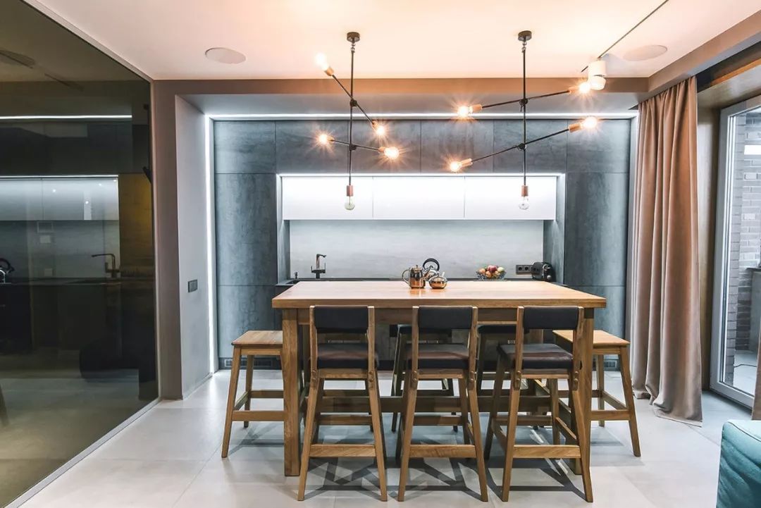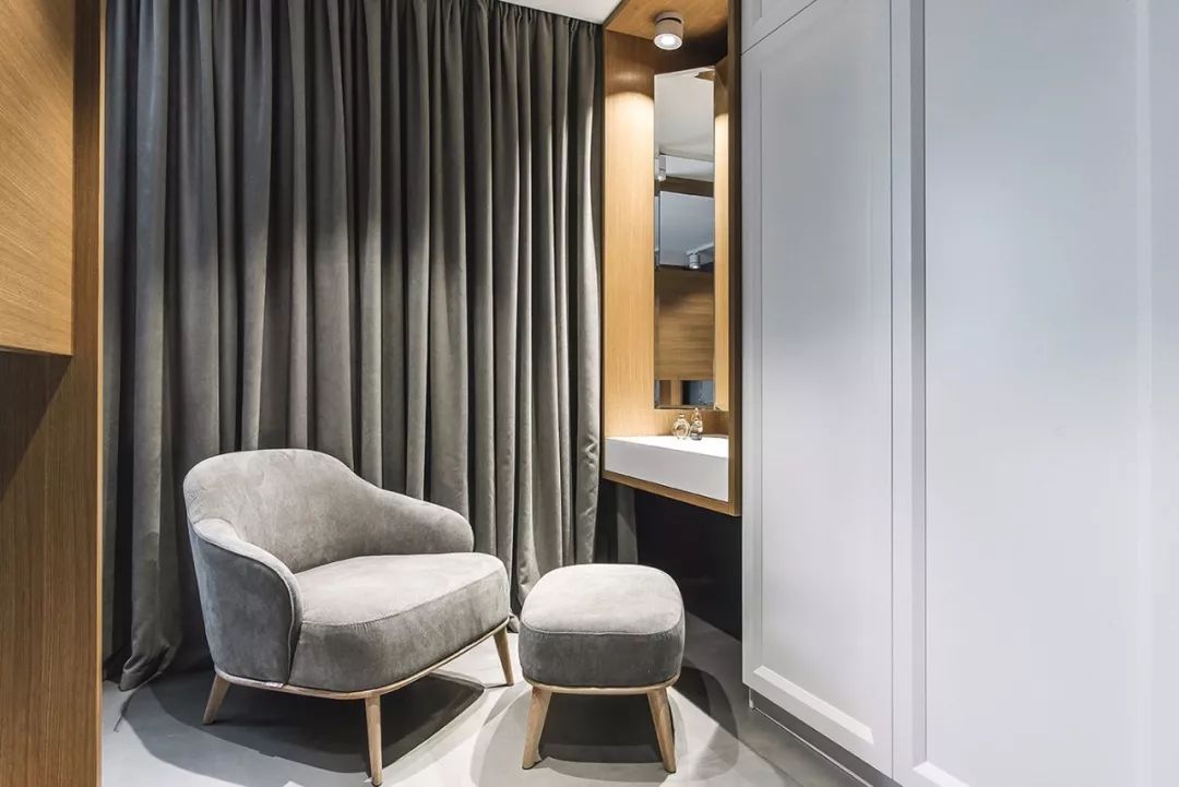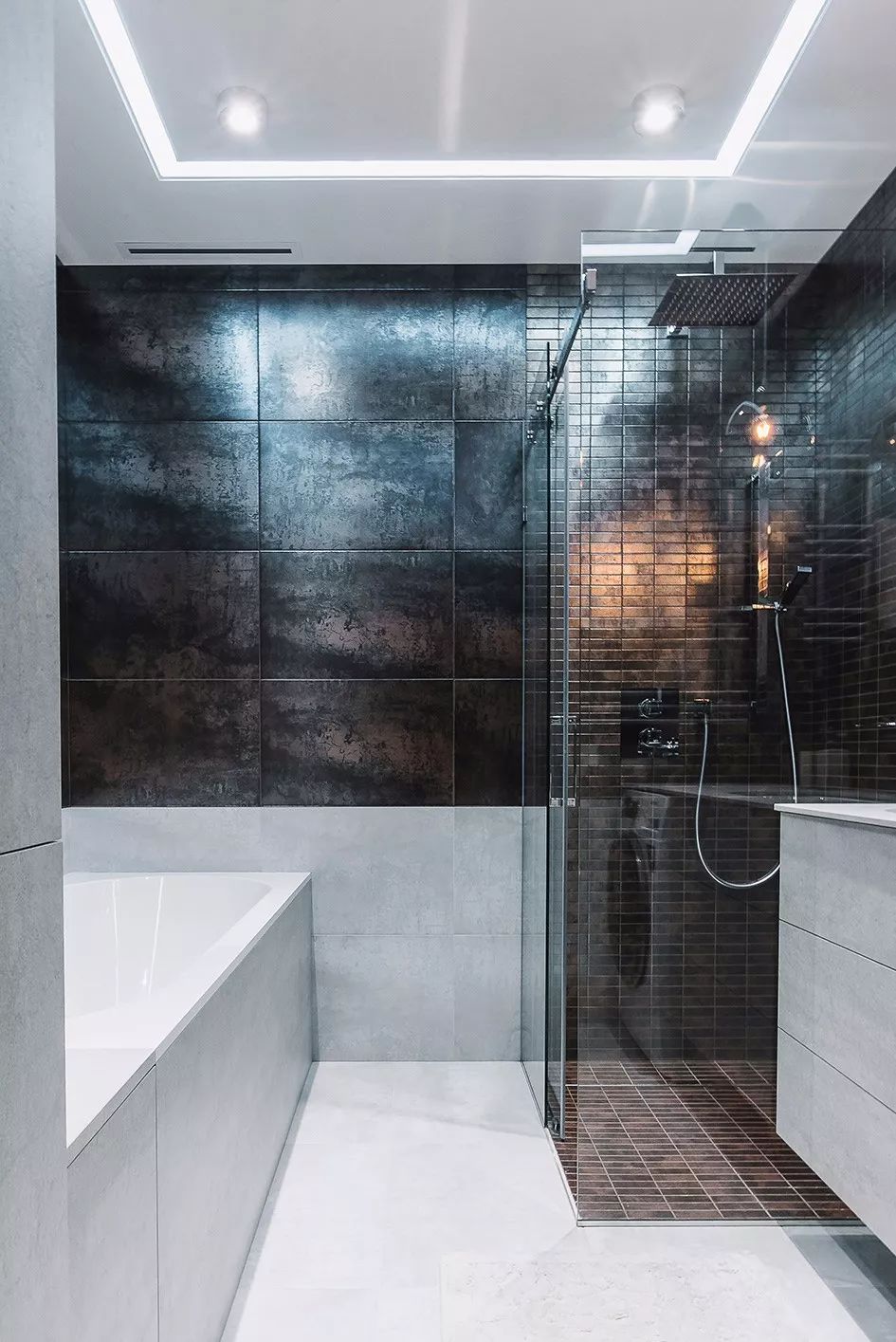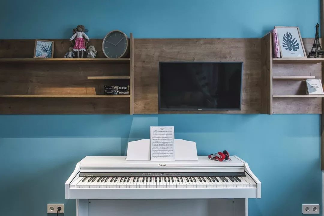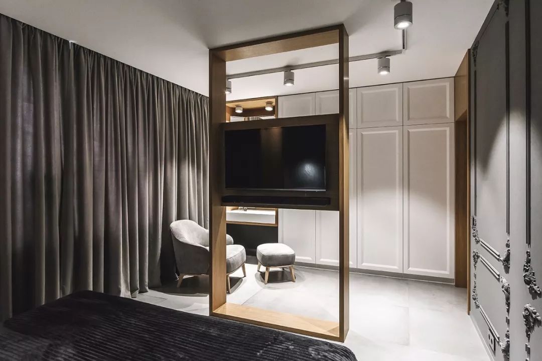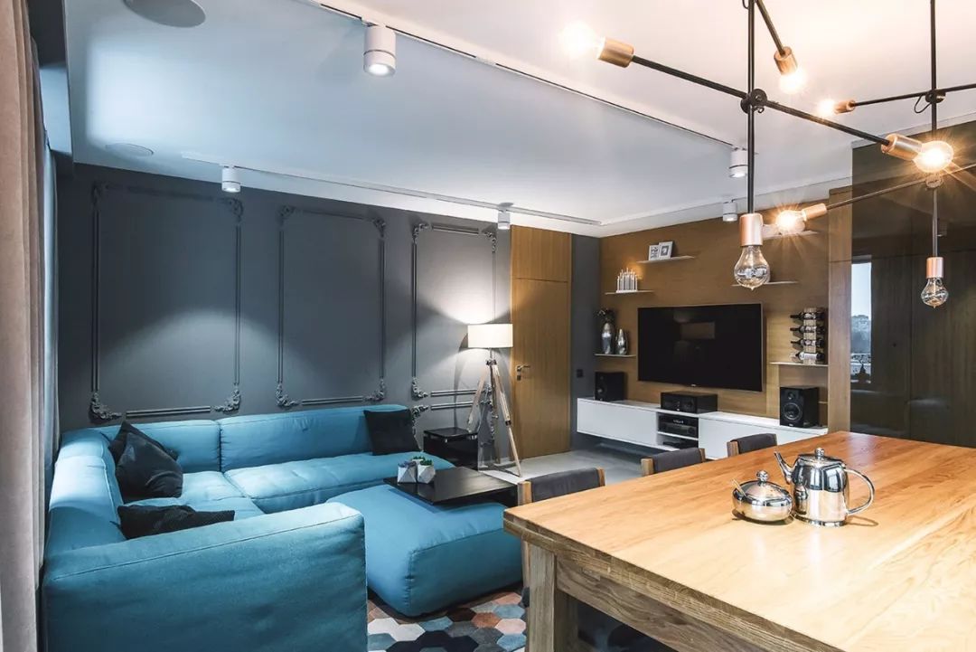 Levko Davydiuk以簡約的設(shè)計(jì)手法來詮釋,105平方米也可以別致,冷色系的灰色廚房、房間,藍(lán)色系兒童房,輔以暖色系的木作電視墻和木質(zhì)家具以增加屋內(nèi)溫度感。
